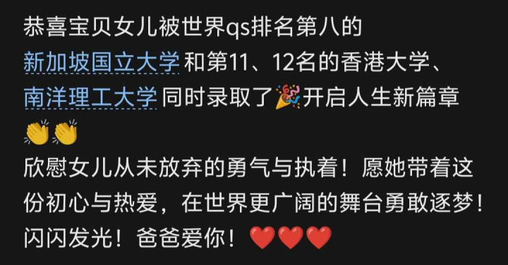 2026年初,一位父亲在朋友圈发了张照片,他女儿同时收到新加坡国立大学、香港大学和南洋理工大学的录取通知,这三所学校的QS排名都在前十二名,比清华北大的排名还高一点,这位父亲本来想分享一下喜悦,没想到评论很快变了味,有人直接说现在留学就像申请个QQ号一样简单,还有人贴出自己亲戚留学回国半年没找到工作的截图。