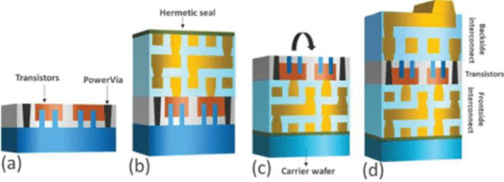 图 2:首先制造晶体管和电源过孔 (a),然后进行多层正面金属化和介质密封 (b),键合到硅载体 (c),最后进行背面电源处理